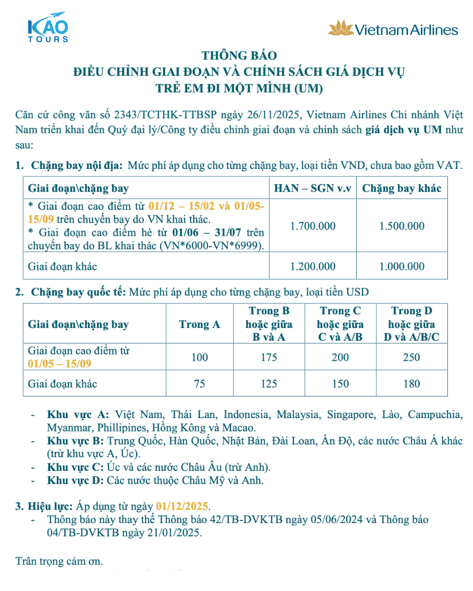 VIETNAM AIRLINES THÔNG BÁO ĐIỀU CHỈNH GIAI ĐOẠN VÀ CHÍNH SÁCH GIÁ DỊCH VỤ TRẺ EM ĐI MỘT MÌNH (UM) 04/12/2025 2:54:32 CH title