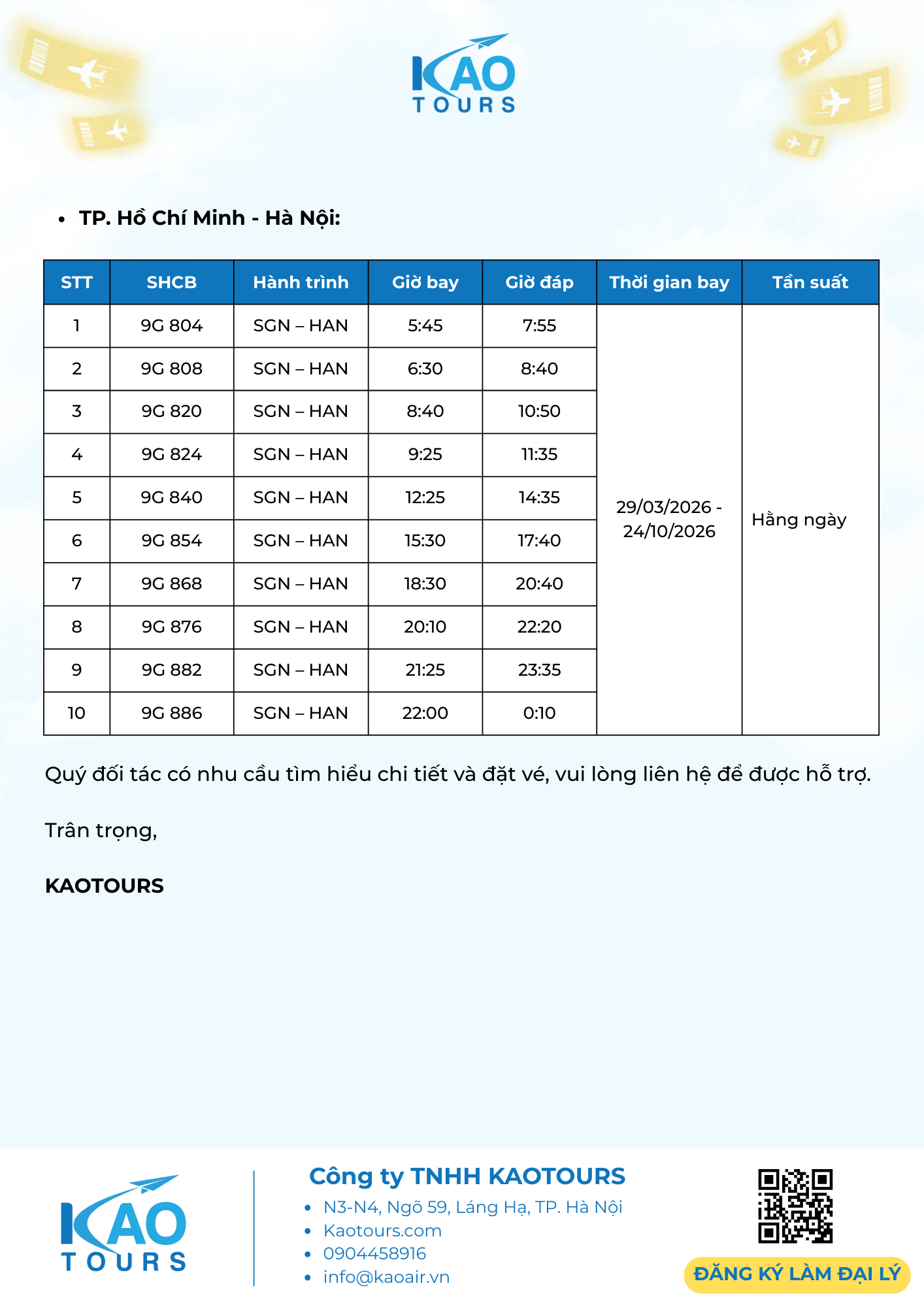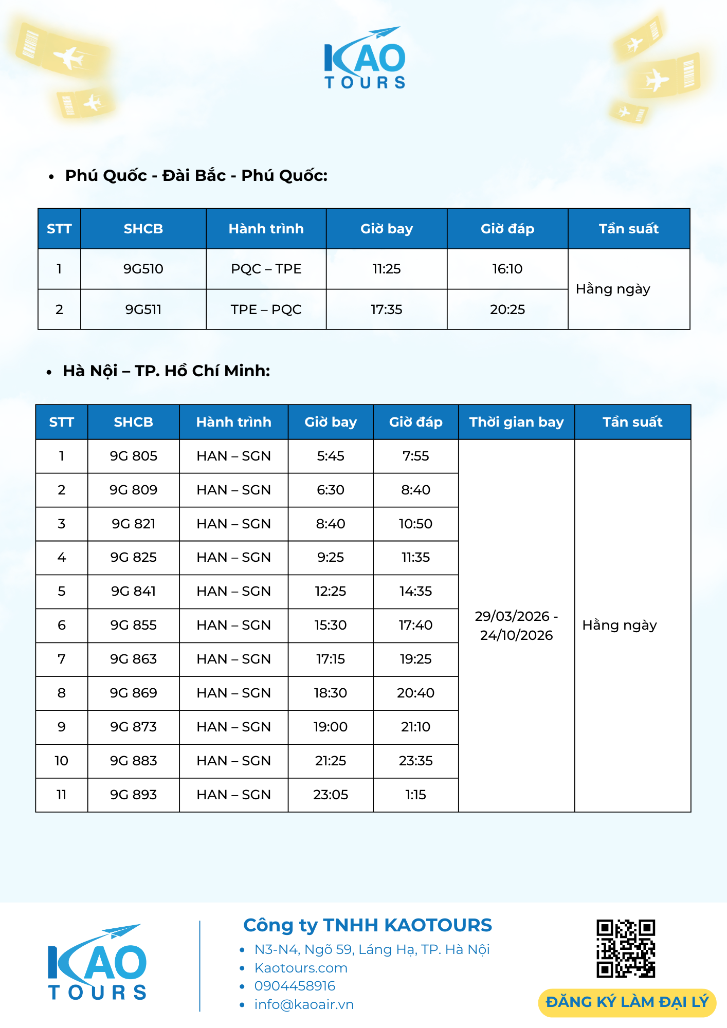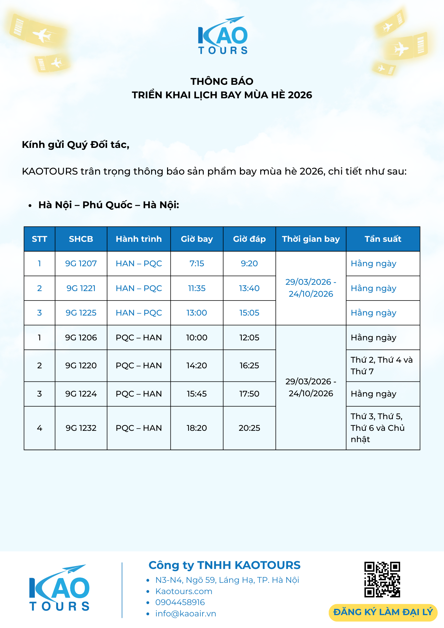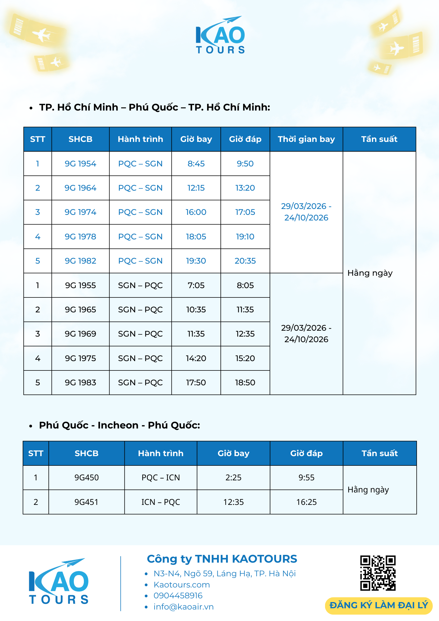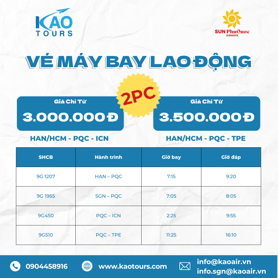 KAOTOURS: THÔNG BÁO - TRIỂN KHAI LỊCH BAY MÙA HÈ 2026 19/01/2026 9:07:22 SA title KAOTOURS thông báo triển khai sản phẩm lao động và lịch bay hè 2026 đến quý đối tác, cụ thể như sau:Giá vé máy bay lao động 2026 chặng HAN/SGN - PQC - ICN và HAN/SGN - PQC - TPE Lịch bay mùa hè 2026 SunPhuQuoc Airways