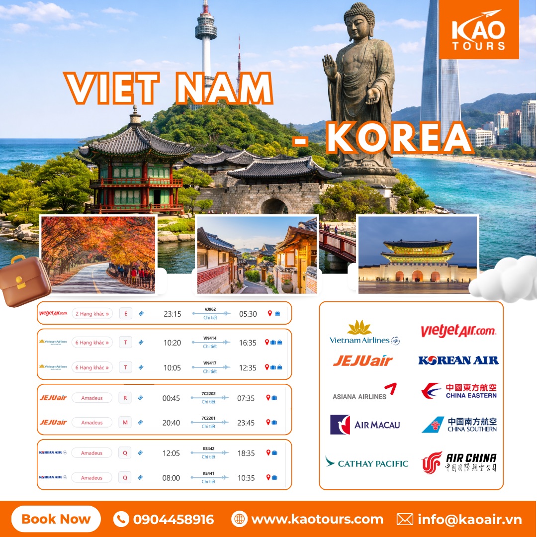 Vé máy bay Việt Nam – Hàn Quốc | Đặt vé nhanh tại KAOTOURS 24/02/2026 1:59:03 CH title Các tuyến bay từ Việt Nam đến Hàn Quốc rất phổ biến, kết nối trực tiếp Hà Nội, TP.HCM, Đà Nẵng, Nha Trang đến Seoul (Incheon) và Busan với thời gian bay trung bình chỉ khoảng 5 tiếng.💰 Giá vé cho một chiều bay chỉ từ nhỉnh 2 triệu VNĐ/chiềuPhục vụ đa dạng nhu cầu: du học, lao động, du lịch, thăm thân, công tác.Hành khách có thể lựa chọn nhiều hãng hàng không nội địa và quốc tế như: Vietnam Airlines, VietJet Air, Korean Air, Asiana Airlines, Jeju Air…KAOTOURS là đại lý chính thức của tất cả các hãng hàng không nội địa và hàng trăm hãng hàng không quốc tế, cung cấp hệ thống đặt vé thuận tiện, kết nối trực tiếp hãng bay và dịch vụ hỗ trợ hành khách chuyên nghiệp với nhiều năm kinh nghiệm trong ngành.